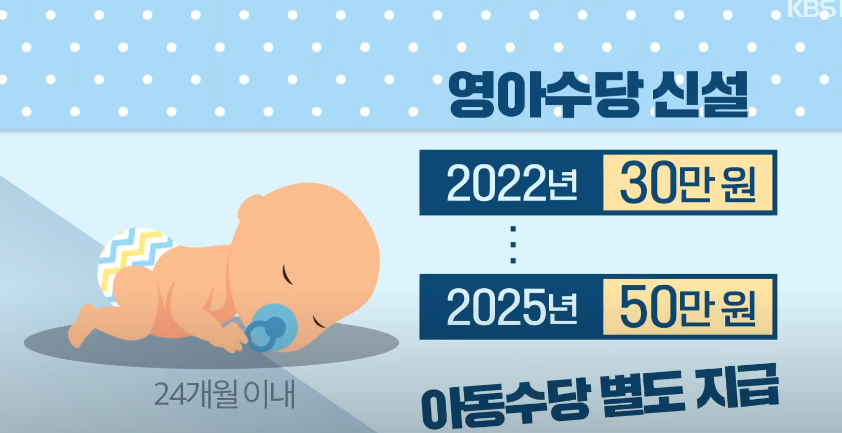 영아수당이란 정부에서 아기를 키우는 부모에게 지급되는 지원금으로 2022년부터 만 0~1세의 영아에게 월 30만 원의 '영아수당'을 지급한다고 합니다. 또한 2025년까지 30만 원에서 50만 원까지 순차적으로 '영아수당' 지원금을 늘린다고 합니다.