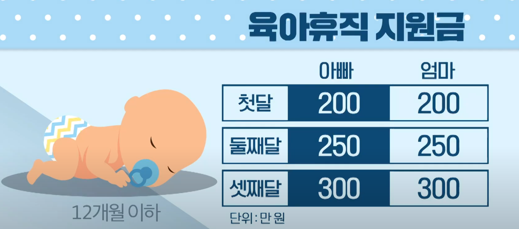 2019년 10만 5천 명이였던 육아휴직 규모를 2025년까지 20만 명으로 늘리기로 하고 3+3 육아유직제를 신설한 다 고합니다. 생후 12개월 미만의 영아가 있는 부모가 둘 다 3개월씩 육아 휴직을 하면 각각 월 최대 300만 원의 육아휴직 수당을 받을 수 있습니다.